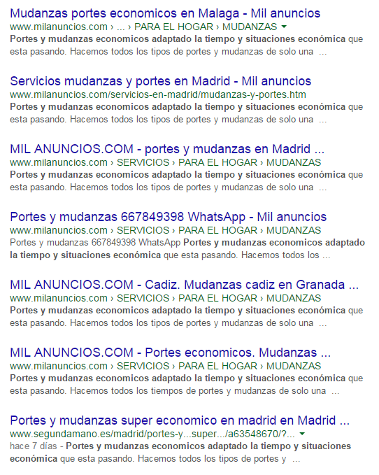 Pues a por ello, si nos preguntamos por qué se repiten tantas veces esos avisos que ya están publicados en Milanuncios la respuesta se adapta perfectamente a la típica frase conocida como «Cantidad pero no calidad«, eso Milanuncios es una web que a diferencia de la gran mayoría lo que te ofrece es cantidad pero no calidad, ya que a este lo que le importa es disponer de la más elevada suma de avisos en sus páginas, sin importarle que estas sean de calidad o no, la prueba de ello es sencilla, usted se mete en la página para empezar a crear su aviso y vera que puede poner cualquier garabato que ya este publicado mil veces en la misma web, es decir puede repetir cuantas veces quiera su anuncio dentro de las pagina, eso no tiene ningún control, es por ello que se va a topar varias veces repetidos el mismo anuncio incluso en el mismo google, resultados que apuntan a Milanuncios como se ve en la imagen que se dispone ahora, que ya ha sido compartida antes.